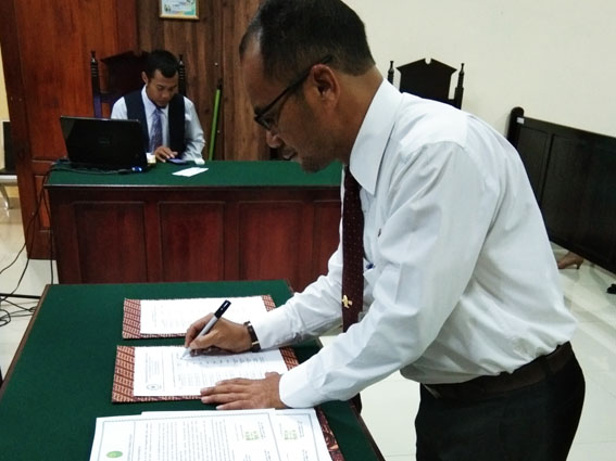 Pernyataan dibacakan oleh Ketua yaitu Bpk. Achmad Peten Sili, SH.MH dan diikuti oleh seluruh karyawan Pengadilan Negeri Kuala Tungkal. Setelah itu satu demi satu menandatangani Pakta Integritas dan Berita Acara Pernyataan Zona Integritas.