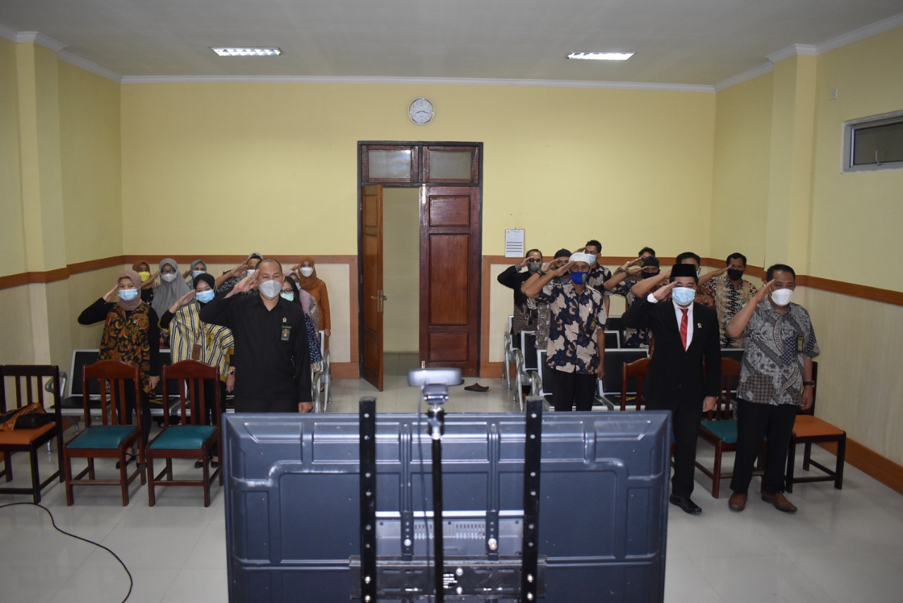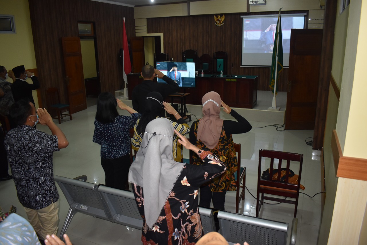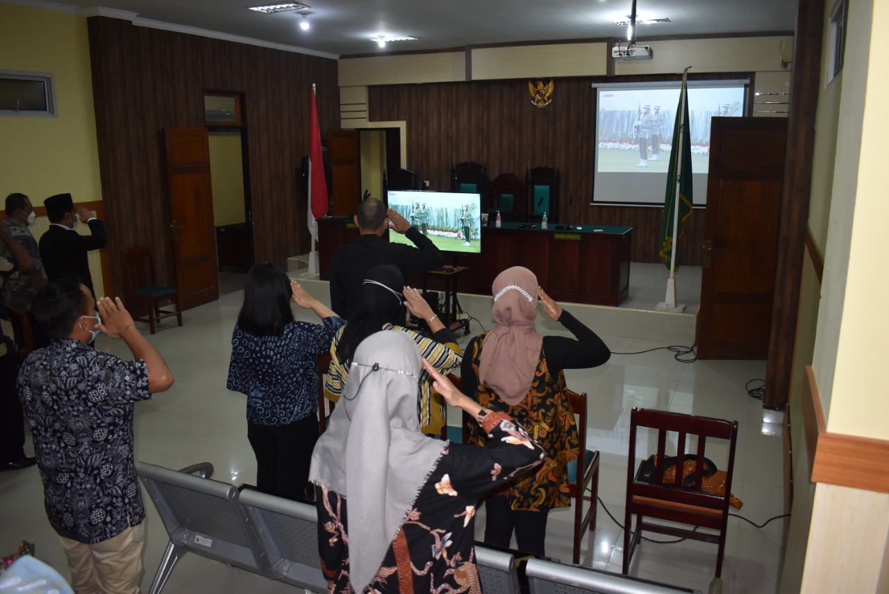 Kuala Tungkal – Dalam rangka memperingati Hari Kesaktian Pancasila yang diperingati setiap tanggal 1 Oktober, Pengadilan Negeri Kuala Tungkal ikut menghadiri acara tersebut secara virtual yang bertempat di Ruang Sidang Cakra Pengadilan Negeri Kuala Tungkal. Acara dimulai pada pukul 07:45 WIB dan dihadiri oleh Wakil Ketua, Panitera, Sekretaris, Hakim dan seluruh pegawai dilingkungan Pengadilan Negeri Kuala Tungkal.