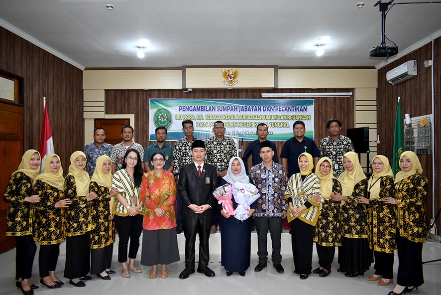 Sehubungan dengan kekosongan jabatan Kasubbag Umum dan Keuangan pada Pengadilan Negeri Kuala Tungkal beberapa bulan lalu, hari ini Ketua Pengadilan Negeri Kuala Tungkal Bpk. Joni Mauluddin Saputra, SH telah melantik dan mengambil sumpah Ibu Nora, SH dari jabatan sebelumnya sebagai Bendahara menjadi Kepala Sub Bagian Umum dan Keuangan.