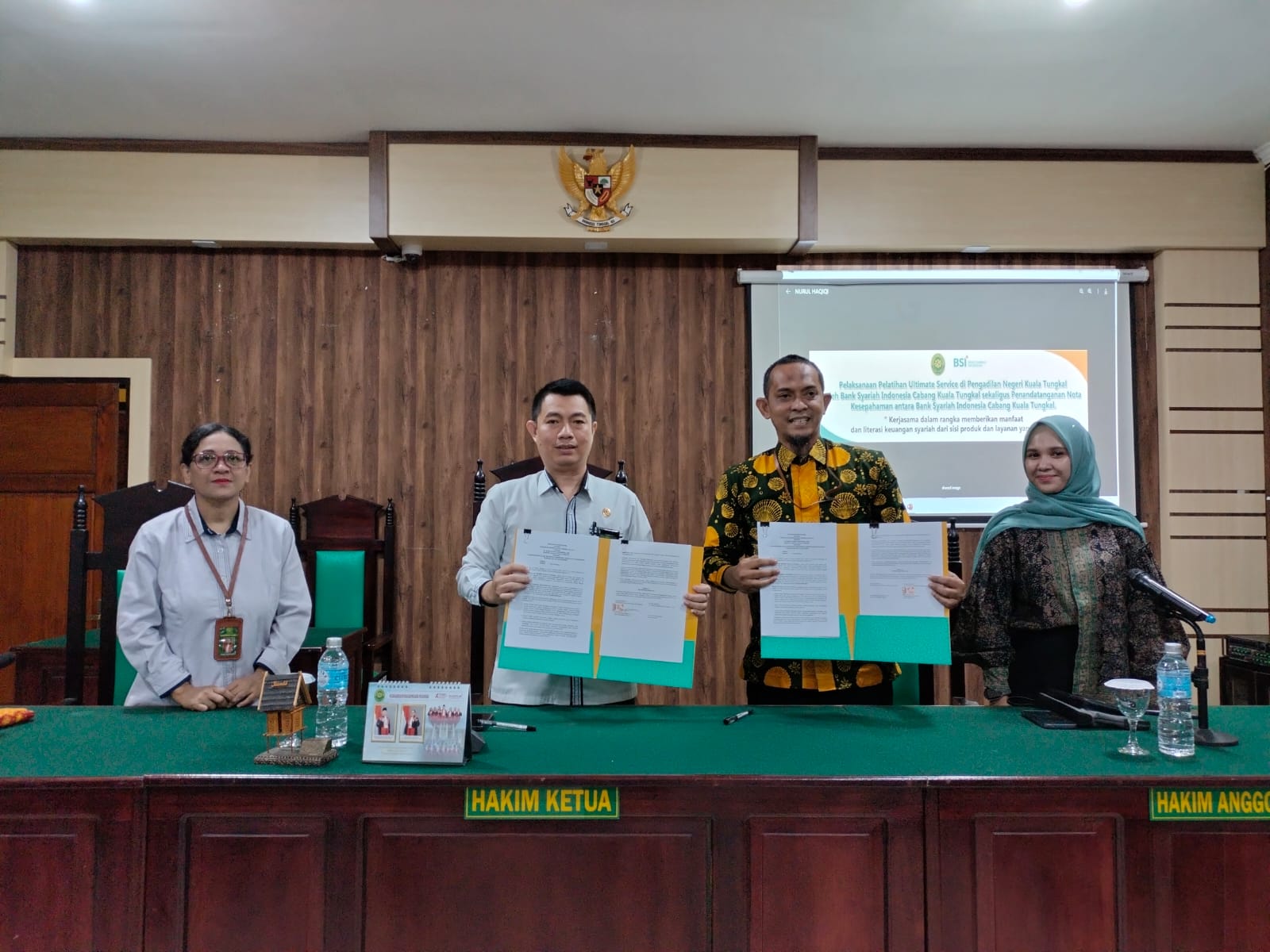 Pengadilan Negeri Kuala Tungkal melaksanakan Kegiatan Penandatanganan Memorandum Of Understanding (MOU) antara Pengadilan Negeri Kuala Tungkal dengan Bank BSI Cab Kuala Tungkal. Acara dimulai pada pukul 09:00 WIB dan dihadiri oleh Ketua, Wakil Ketua, Hakim, Sekretaris dan seluruh pegawai dilingkungan Pengadilan Negeri Kuala Tungkal.