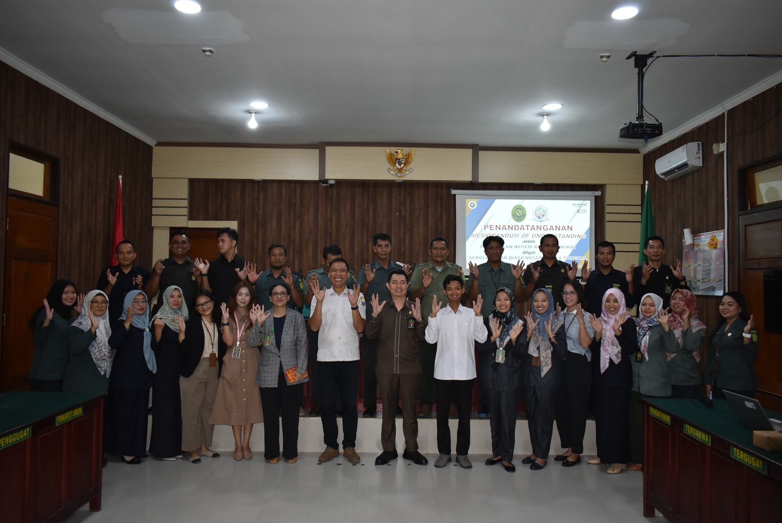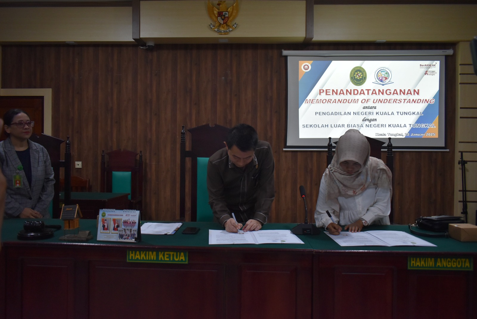 Pengadilan Negeri Kuala Tungkal melaksanakan Kegiatan Penandatanganan Memorandum Of Understanding (MOU) antara Pengadilan Negeri Kuala Tungkal dengan Sekolah Luar Biasa Negeri Kuala Tungkal. Acara dimulai pada pukul 08:00 WIB dan dihadiri oleh Ketua, Wakil Ketua, Hakim, Plt. Panitera, Sekretaris dan seluruh pegawai dilingkungan Pengadilan Negeri Kuala Tungkal.
