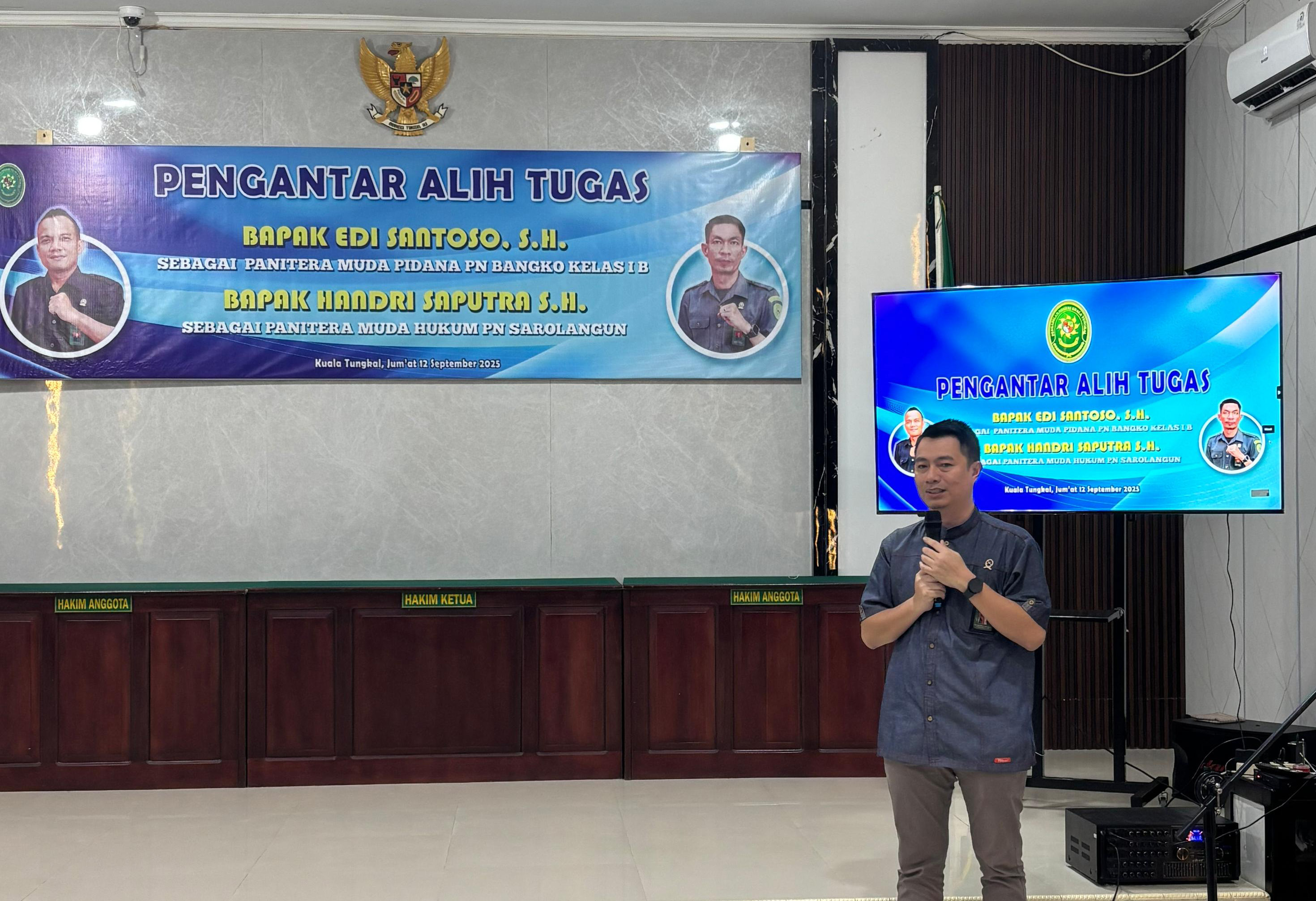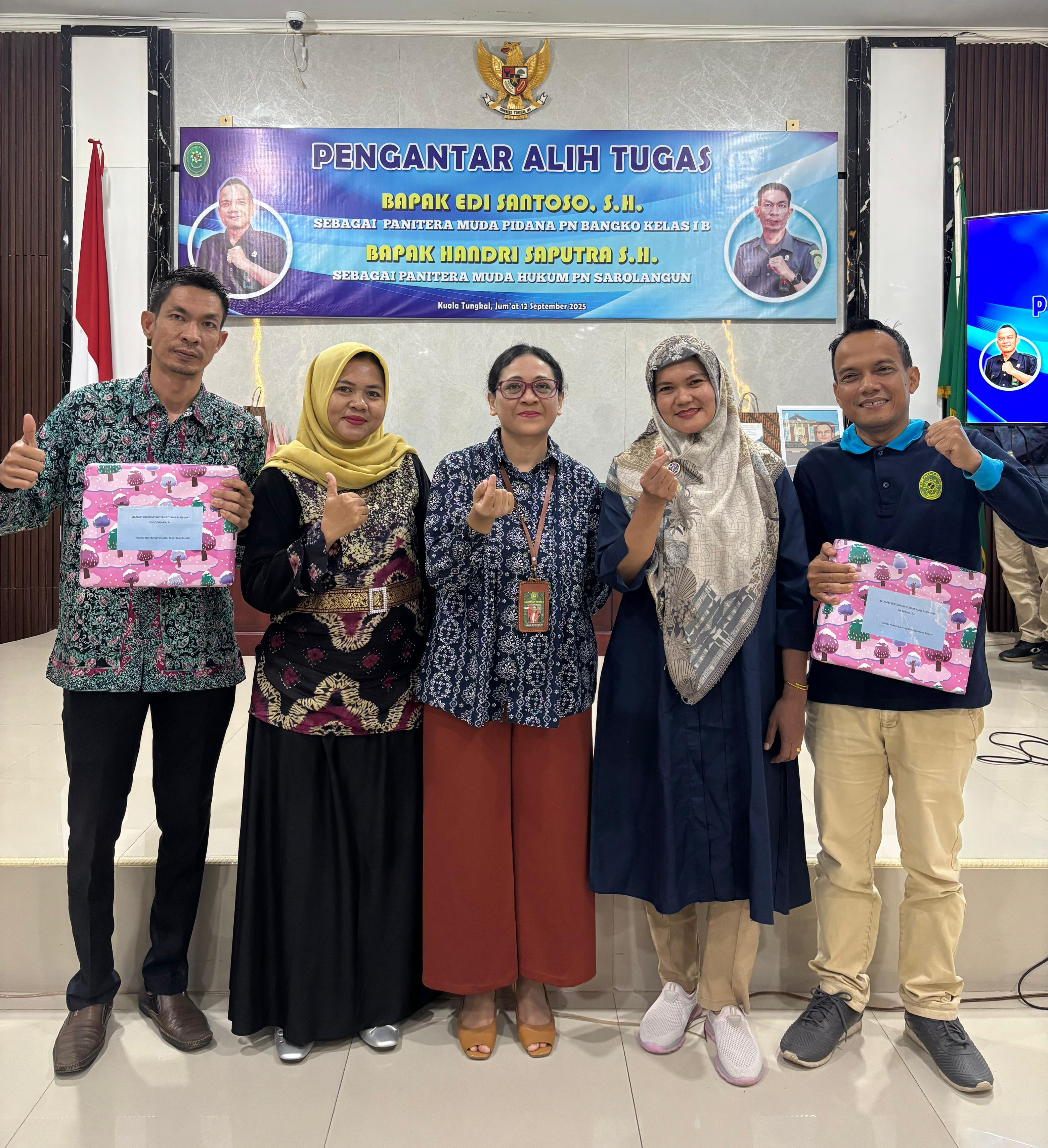 Pengadilan Negeri Kuala Tungkal menggelar Acara Pengantar Alih Tugas bagi Panitera Muda Perdata dan Panitera Pengganti yang akan promosi ke Satuan Kerja yang baru. Acara dimulai pada pukul 09:00 WIB dan dihadiri oleh Ketua, Wakil Ketua, Hakim, Pejabat Struktural dan Pejabat Fungsional serta seluruh pegawai dilingkungan Pengadilan Negeri Kuala Tungkal.