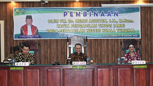 Ketua Pengadilan Tinggi Jambi YM. Dr. Herdi Agusten, S.H., M.Hum melaksanakan Kegiatan Pembinaan Pada Pengadilan Negeri Kuala Tungkal. Acara dilaksanakan di Ruang Sidang Cakra Pengadilan Negeri Kuala Tungkal dan dihadiri oleh Ketua, Wakil Ketua, Para Hakim, Panitera, Sekretaris, Pejabat Struktural dan Fungsional, Pegawai dan PPNPN.